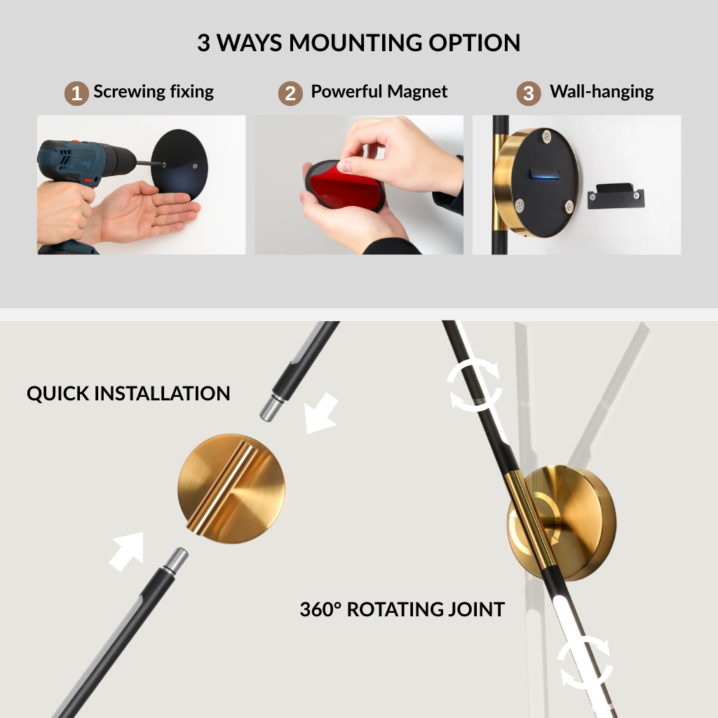 Transform your space with the Pivora Rechargeable Wall Lamp, a sleek, wireless lighting solution designed for modern living. Crafted from premium aluminium with a 360° rotating joint, this wall lamp offers complete flexibility and style. With tri-colour LED lighting (cool white, natural white, and warm white), you can set the perfect mood for your bedroom, living room, or workspace.